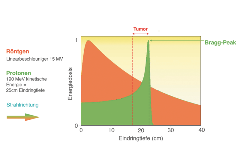 Forschung und Fortschritte konzentrieren sich heute daher auf die Protonentherapie. Hierbei ersetzten beschleunigte Wasserstoffatomkerne die alten Röntgenstrahlen. Die Methode macht sich ein vor über hundert Jahren entdecktes Phänomen zu Nutze. Die in den Körper eindringenden Protonen geben zunächst nur wenig Energie ab, setzen wenige Schäden. Sie werden aber langsamer, der Schaden, die Wirkung, die Ionisation konzentriert sich in einem lokalen Gipfel, nach dem Entdecker Bragg-Peak genannt (Abbildung). Die Beschleunigung der Protonen ist wählbar, der Bragg-Peak auf diese Weise millimetergenau in den Tumor zu justieren. Im Gegensatz zu Röntgen, wo das gesunde Gewebe immer mit einer größeren Menge an Strahlung belastet wird als der Tumor selbst, tritt vor dem Tumor im Einstrahlungsbereich eine niedrigere Strahlung als bei Röntgen auf, hinter dem Tumor fällt keine Dosis mehr an. Von Nebenwirkungen im hohen Maße befreit, kann der Therapeut die Strahlenwirkung und Sterilisation der Zellen wesentlich präziser in den Krebs konzentrieren. An der größten und fortschrittlichsten Protonenanlage in Europa, dem RPTC in München bündeln sich daher die aktuellen Entwicklungsschritte: