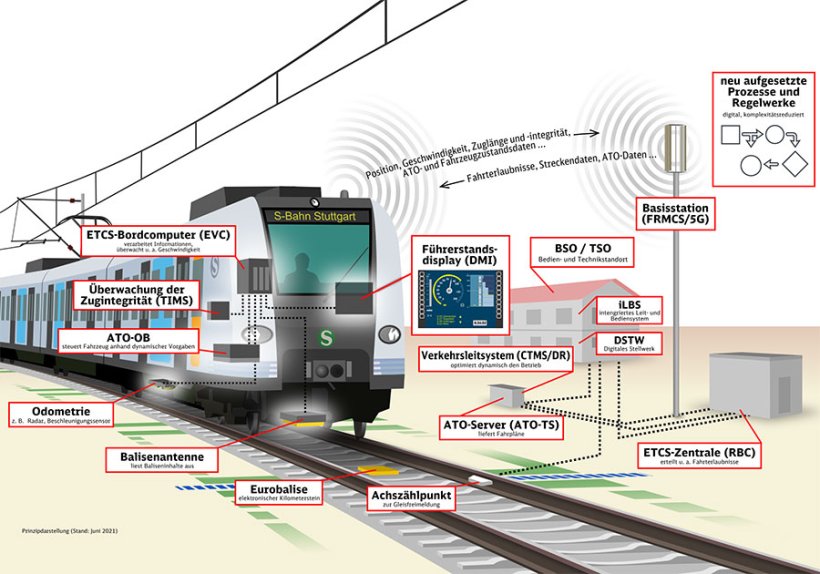 Mit ETCS sind keine Signale mehr erforderlich. Anstelle von bisher roten, gelben und grünen Lichtpunkten erhält der Triebfahrzeugführer über ein Display die für die Fahrt notwendigen Informationen. Zug und Strecke stehen über eine verschlüsselte Funkverbindung im laufenden Austausch: Die Strecke teilt dem Zug die Distanz zum vor ihm befindlichen Zug mit. Der Zug meldet in kurzen Abständen wiederum seinen genauen Standort und seine Geschwindigkeit. Weg und Geschwindigkeit des Zuges werden lückenlos überwacht. ETCS ermöglicht es unter anderem, höhere Geschwindigkeiten zu fahren und lässt gleichzeitig dichtere Zugfolge zu. So können Verspätungen abgebaut werden und bis zu 30 Prozent mehr S-Bahnen fahren – auf der bestehenden Infrastruktur. Das Stellwerk wacht im Hintergrund weiter über die Belegung von Gleisabschnitten und die Lage von Weichen und gibt diese Informationen an ETCS weiter. Die neue Technik macht ab 2025 zuerst die Stammstrecke zwischen Hauptbahnhof (tief) und Schwabstraße fit. 2030 folgt dann das gesamte S-Bahn-Netz in der Region. Dank der digitalen Kommunikation kann teilautomatisiert gefahren werden, der Lokführer bleibt aber an Bord.