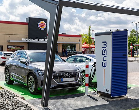 Dort laden aktuelle E-Autos je nach Konfiguration in nur sechs bis acht Minuten genug Strom für die nächsten 100 Kilometer – ohne Umweg zur Tankstelle und ohne Schlange an der Kasse.